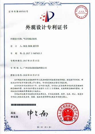 氣壓檢漏試驗機-外觀專利證書【岳信公司】